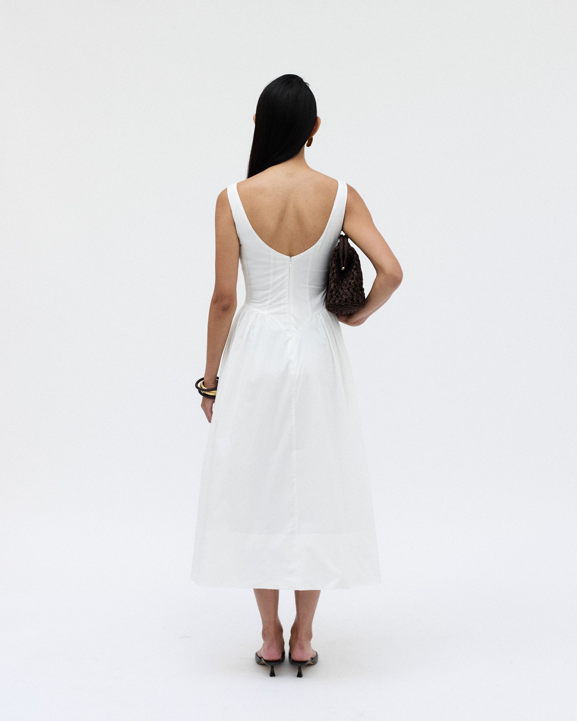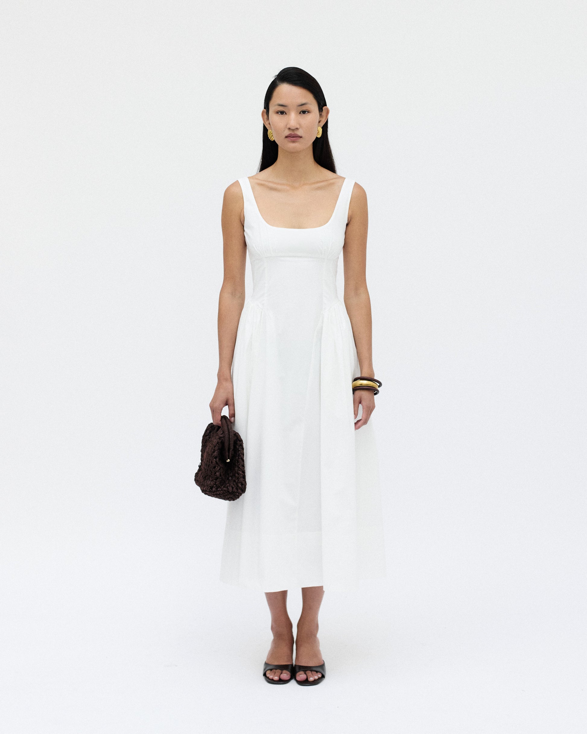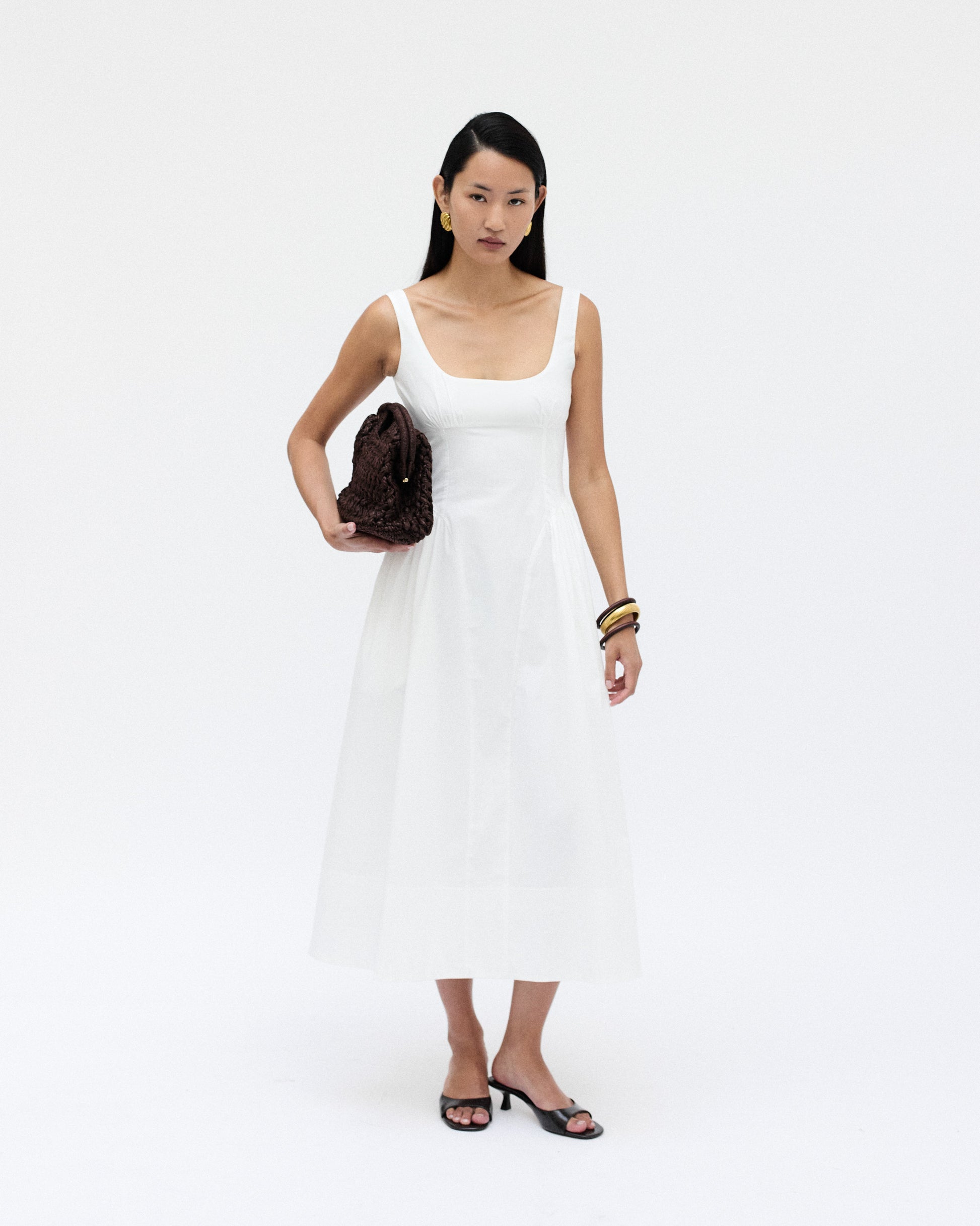Our Baiana Dress is crafted from a soft, slightly stretchable cotton blend for ultimate comfort. The fitted bodice embraces the silhouette, accentuating the waist and hips in a confident minimalistic design perfect for carefree moments. This design embodies ease and elegance all at once.